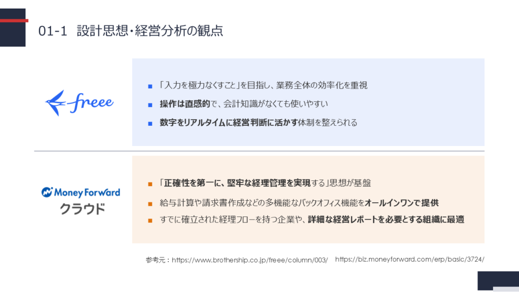 freeeとマネーフォワードはそれぞれ設計思想・経営分析の観点API・連携性の観点で異なる特徴を持っています。