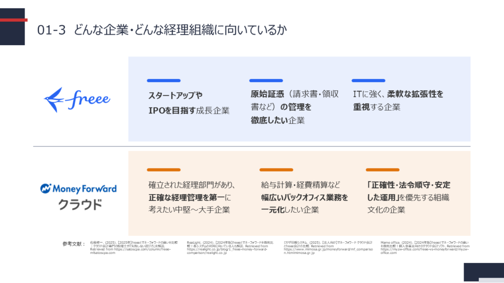 ここでは、freeeとマネーフォワードの「設計思想・経営分析の観点」と「API・連携性の観点」、さらに「どんな企業・どんな経理組織に向いているか」を整理しながら、自社業務への適合性を考えます。