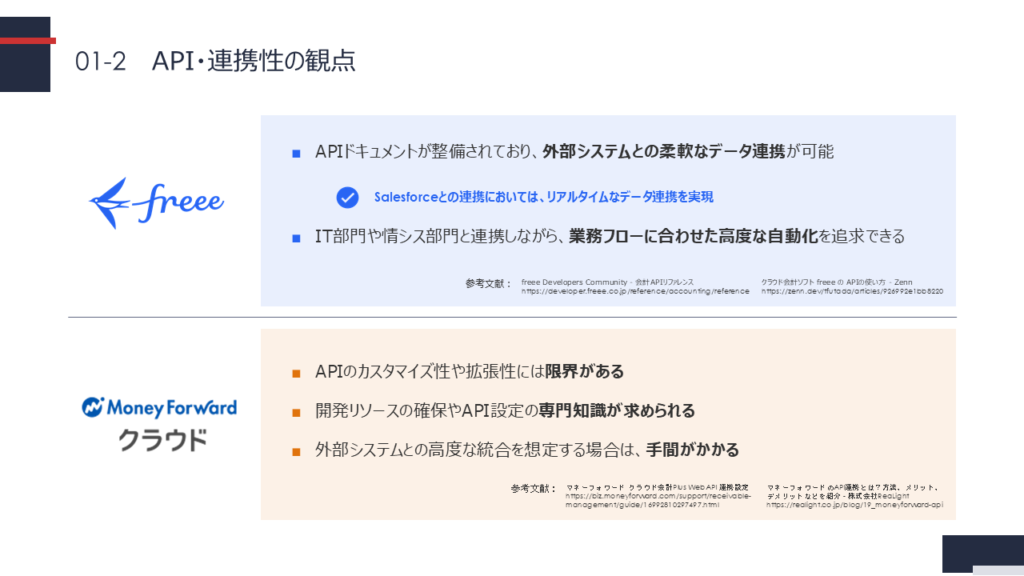 会計業務の効率化・自動化を考える際、APIの柔軟性と他システムとの連携性は非常に重要なポイントです。freeeとマネーフォワードでは、このAPI・連携性の面でも特性が大きく異なります。
