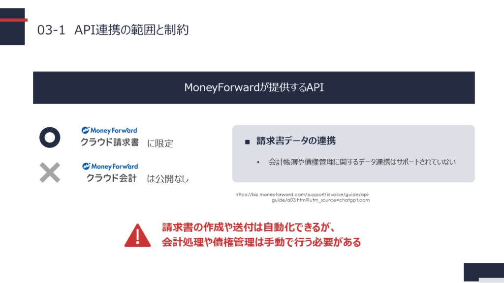 マネーフォワードが提供するAPIは主に「クラウド請求書」サービスに限定されており、「クラウド会計」サービスのAPIは一般公開されていません。