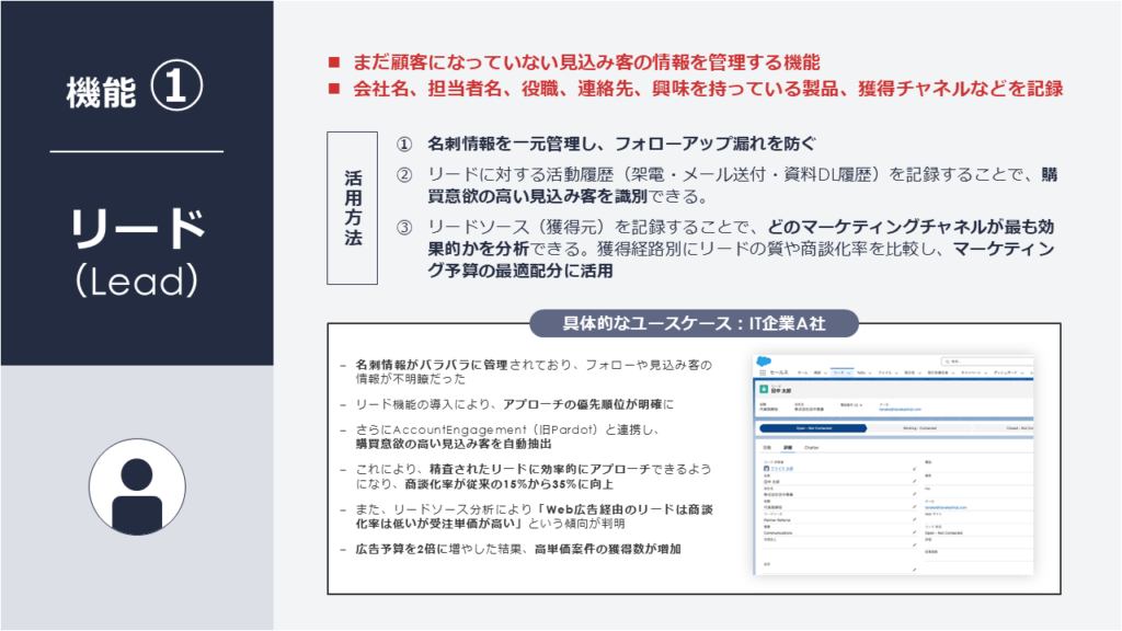 リードは、まだ顧客になっていない見込み客の情報を管理する機能です。