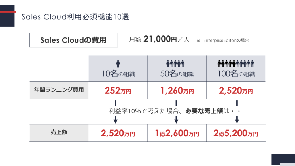 また、利益率10%で考えると、既存の売上に「追加」が必要となります。