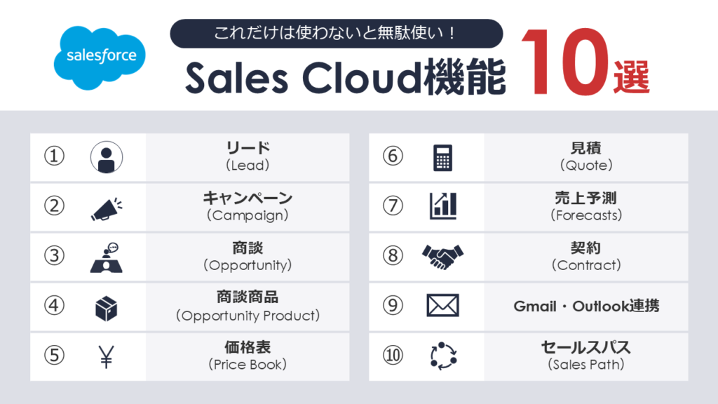 さて、ここからはいよいよ本ブログの主題であるSales Cloudを最大限に活用するために押さえておくべき10の機能をご紹介します。