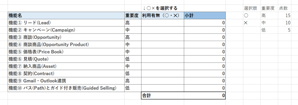 それぞれの機能に重要度をつけておりますので、自社のSalesCloud利活用具合のランクをチェックしましょう。