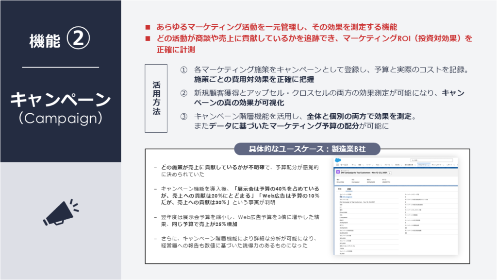各施策から獲得したリードや取引先責任者を紐づけることで、どの活動が商談や売上に貢献しているかを追跡でき、マーケティングROI(投資対効果)を正確に計測できます。
