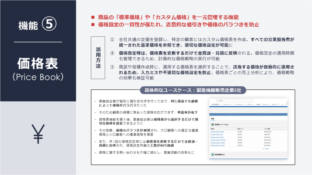 価格表(Price Book)は、商品の標準価格やカスタム価格を一元管理する機能です。