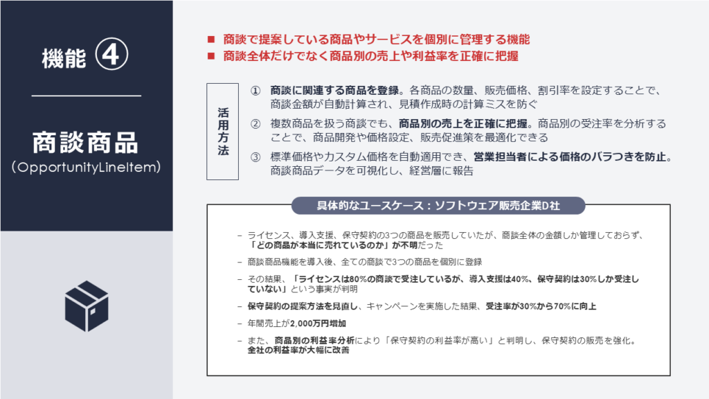 商談商品(Opportunity Product)は、商談で提案している商品やサービスを個別に管理する機能です。