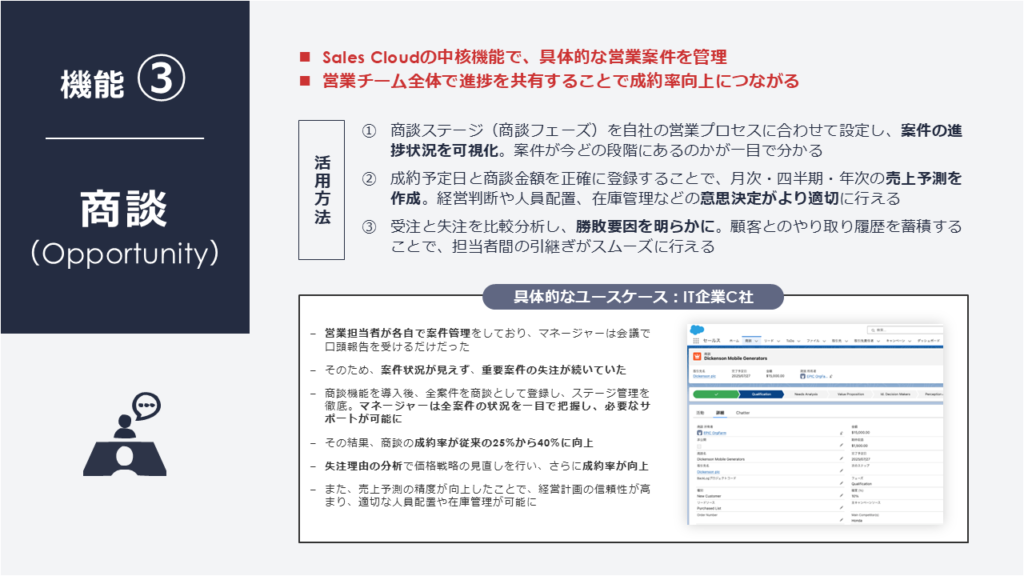商談(Opportunity)は、Sales Cloudの中核機能で、具体的な営業案件を管理します。