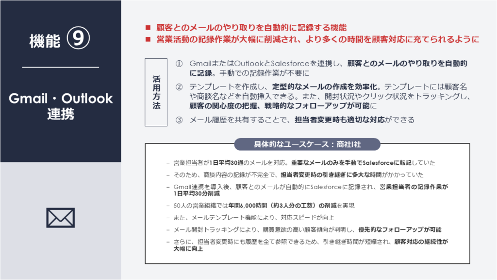 Gmail・Outlook連携は、メールクライアントとSalesforceを連携させ、顧客とのメールのやり取りを自動的に記録する機能です。