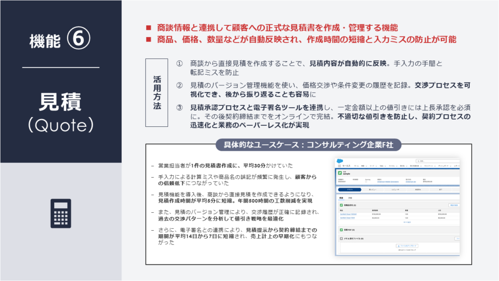 見積(Quote)は、商談情報と連携して顧客への正式な見積書を作成・管理する機能です。