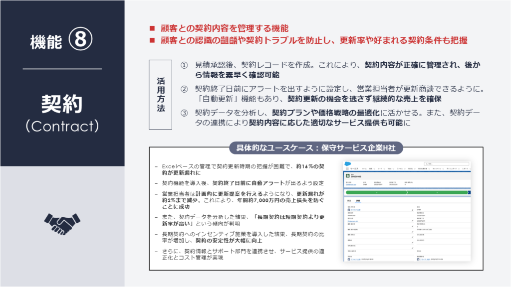 契約内容を正確に記録することで、顧客との認識の齟齬や契約トラブルを防止し、契約データの分析により更新率や顧客に好まれる契約条件などの戦略的なインサイトも得られます。