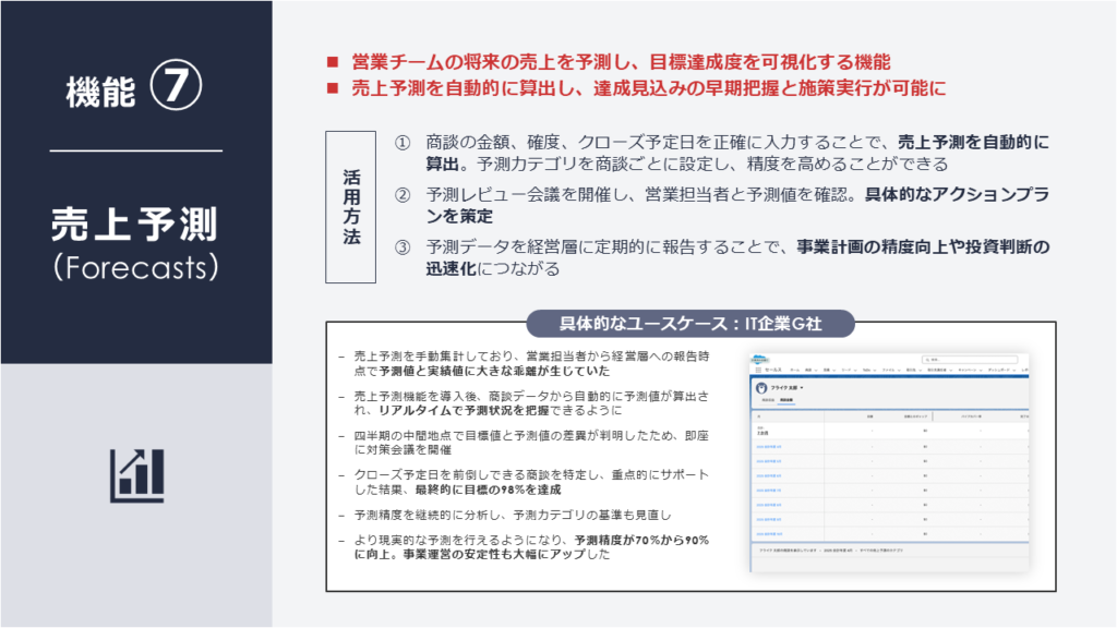 また、予測の精度を継続的に分析することで、営業プロセスの改善にもつながります。