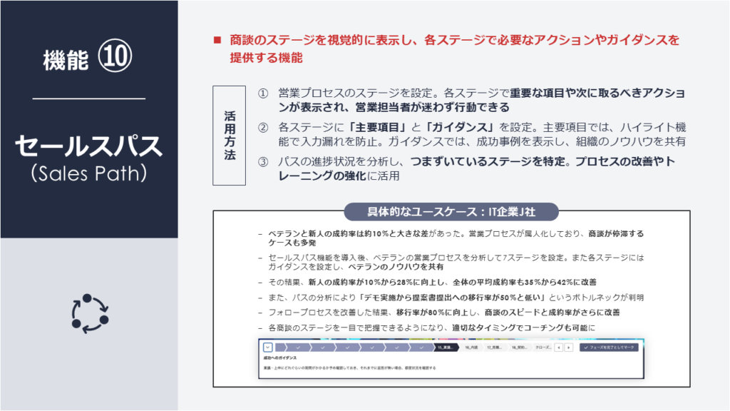 セールスパス(Sales Path)は、商談のステージを視覚的に表示し、各ステージで必要なアクションやガイダンスを提供する機能です。営業プロセスを標準化することで、営業担当者は「今、何をすべきか」を明確に理解できます。これにより商談を前に進める方法が明文化され、営業の属人化を解消し、成約率の向上につながります。特に新人営業担当者にとっては、ベテランの営業プロセスを学びながら実践できる効果的な教育ツールとしても機能します。