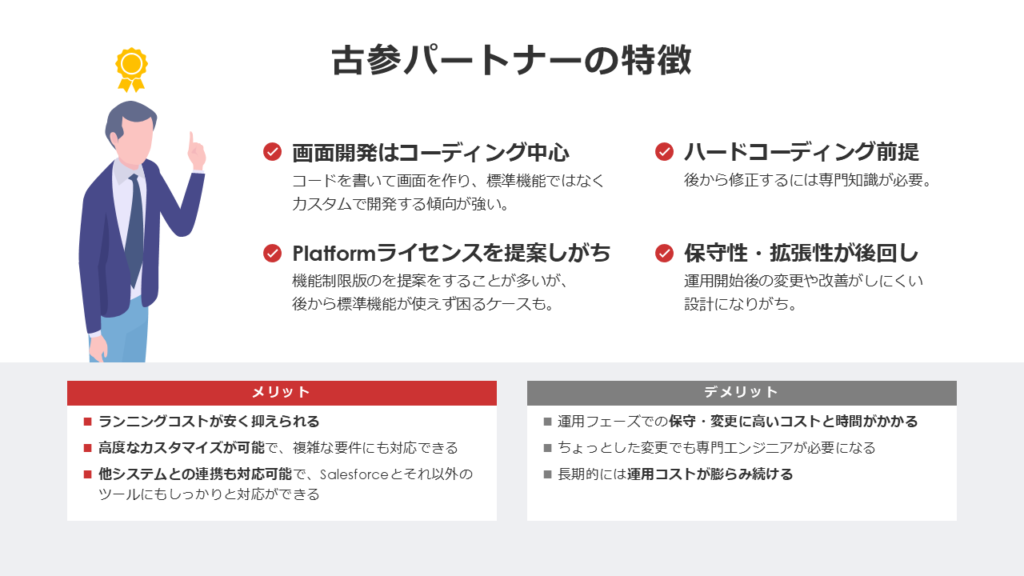 古参パートナーは、Salesforceが「開発基盤」として使われていた時代の思想を持つパートナーです。以下のような特徴があります。