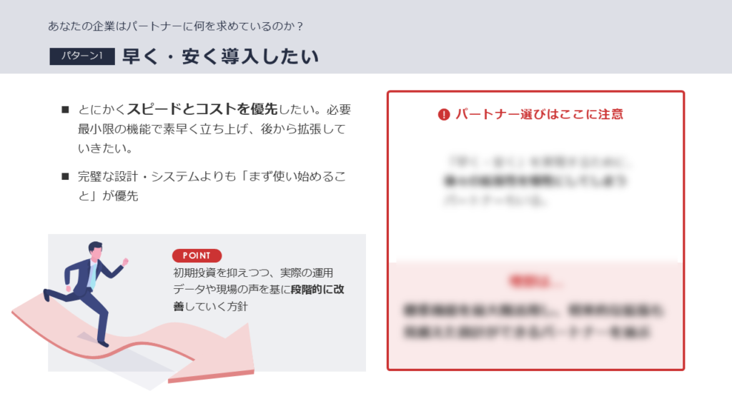 ただし注意が必要なのは、「安く・速く」を実現するために、後々の拡張性を犠牲にしてしまうパートナーもいるという点です。