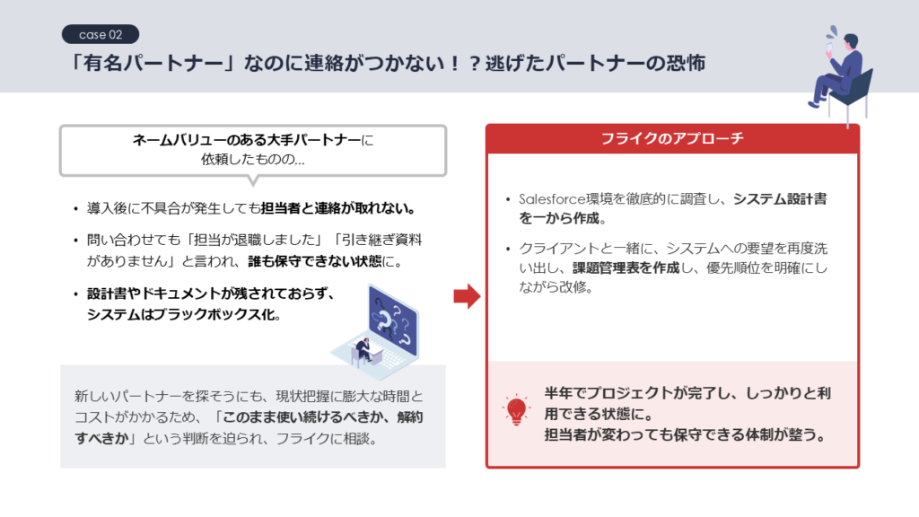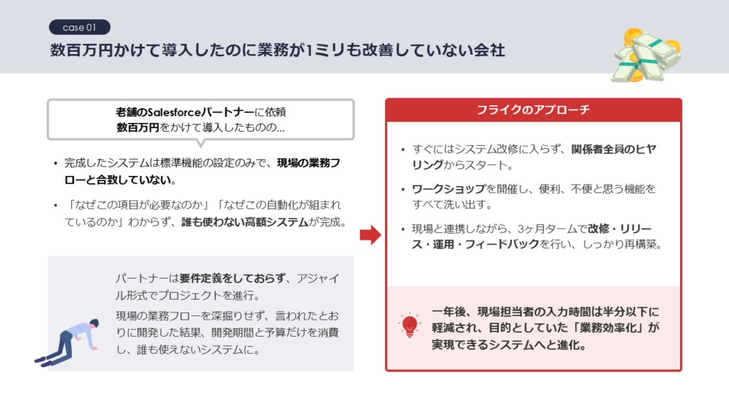 フライクには、他社パートナーが導入したSalesforce環境について、以下のような衝撃的な相談が寄せられています。