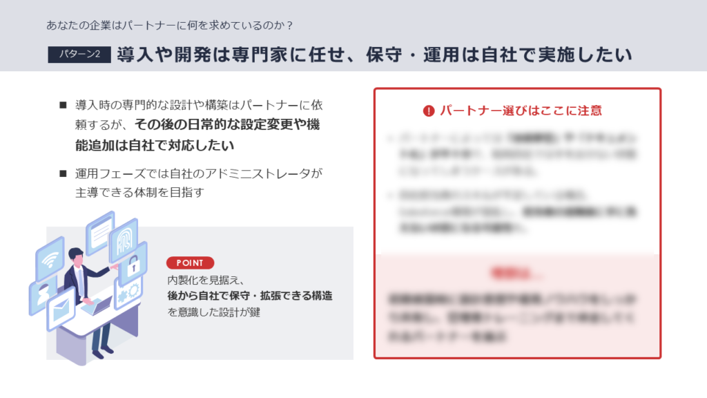◎理想は、初期構築時に設計思想や運用ノウハウをしっかり共有し、管理者トレーニングまで伴走してくれるパートナーを選ぶことです。