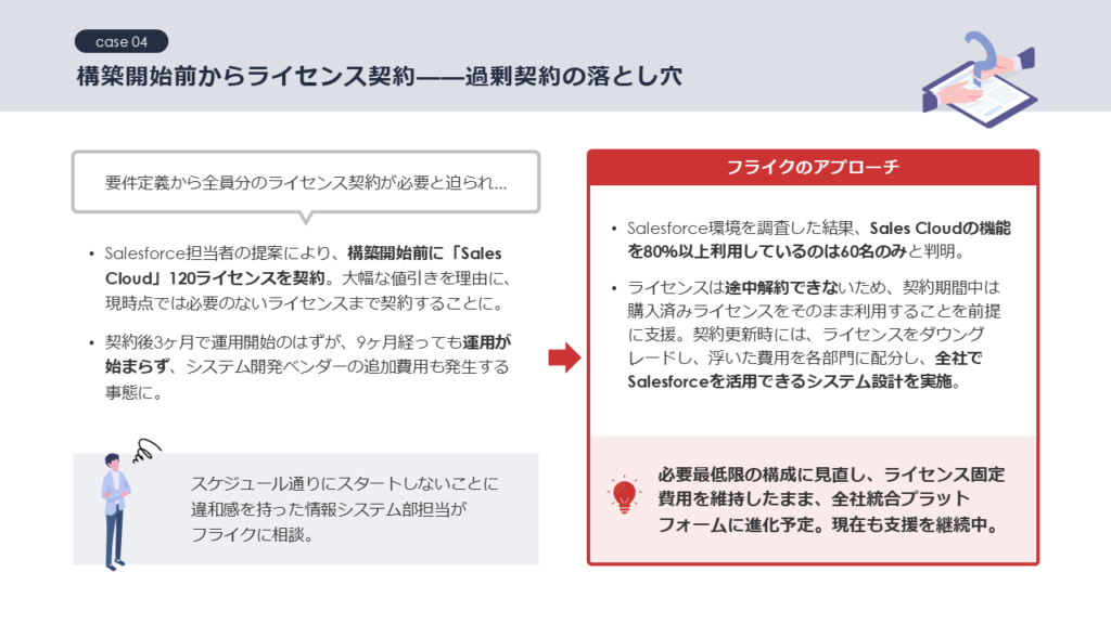 Salesforceの導入を決定した企業が、構築開始前にSales Cloud 120ライセンスを3年契約で締結してしまったケースがありました。