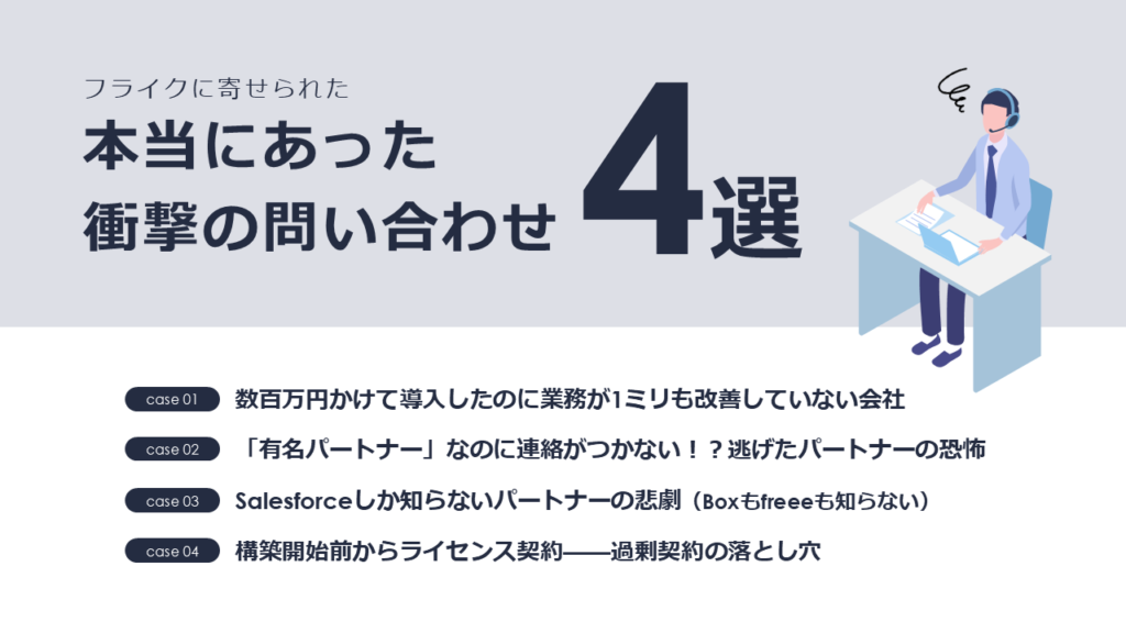 フライクには他社パートナーが導入したSalesforce環境について、驚くような相談が日々寄せられています。その中でも特に衝撃的だった事例を4つご紹介します。