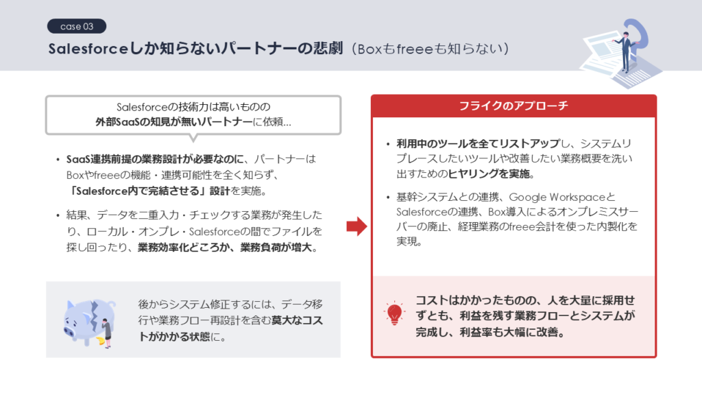 さらに深刻だったのは、このパートナーがBoxやfreeeの機能や連携可能性を全く知らなかった点です。「Salesforceでできることは全てSalesforceで」という姿勢で進められた結果、後から修正するにはデータ移行や業務フロー再設計を含む莫大なコストがかかる状態になってしまいました。