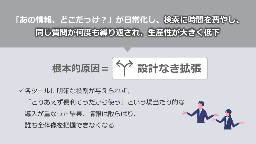 各ツールに明確な役割が与えられず、「とりあえず便利そうだから使う」という場当たり的な導入が重なった結果、情報は散らばり、誰も全体像を把握できなくなるのです。