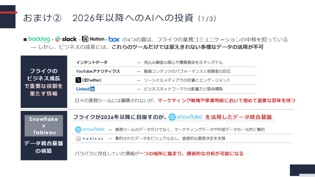 ここまで紹介してきたSlack・Backlog・Notion・Boxの4つの器は、フライクの業務コミュニケーションの中核を担っています。しかし、ビジネスの成長には、これらのツールだけでは捉えきれない多様なデータの活用が不可欠です。