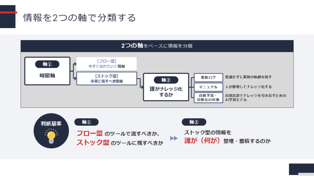 フロー型情報とは、その瞬間に必要だが、後で読み返す必要がない情報のことです。例えば、「今日のランチどうする?」「この件、今確認できる?」といった即時性の高いコミュニケーションが該当します。