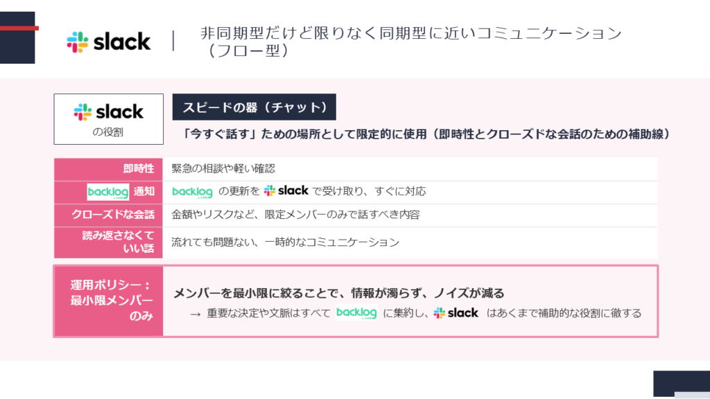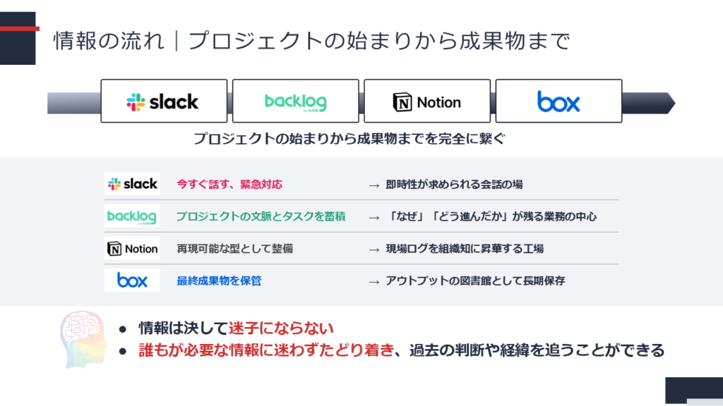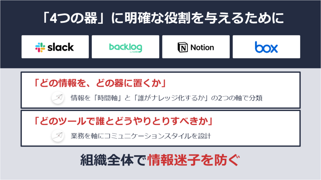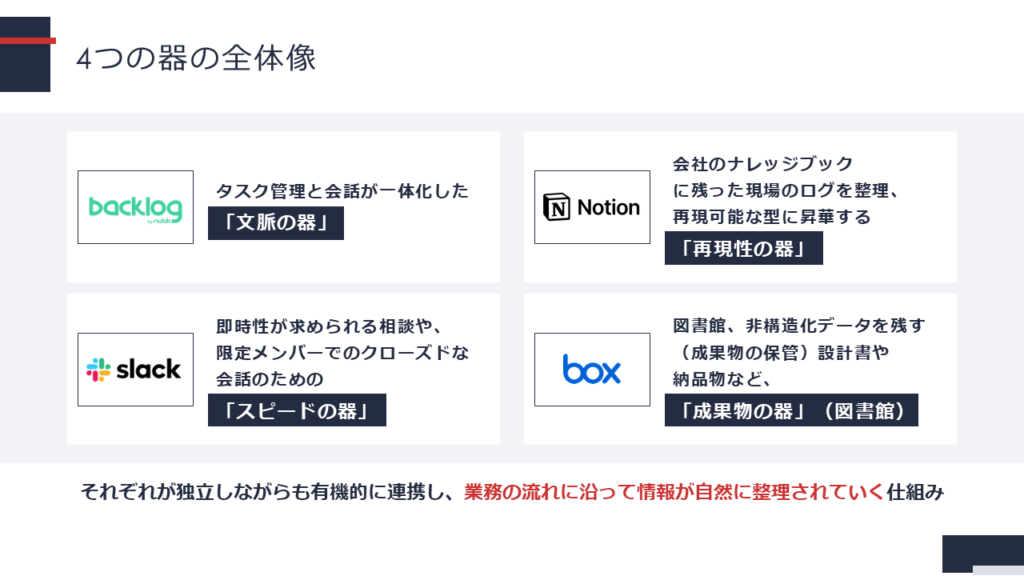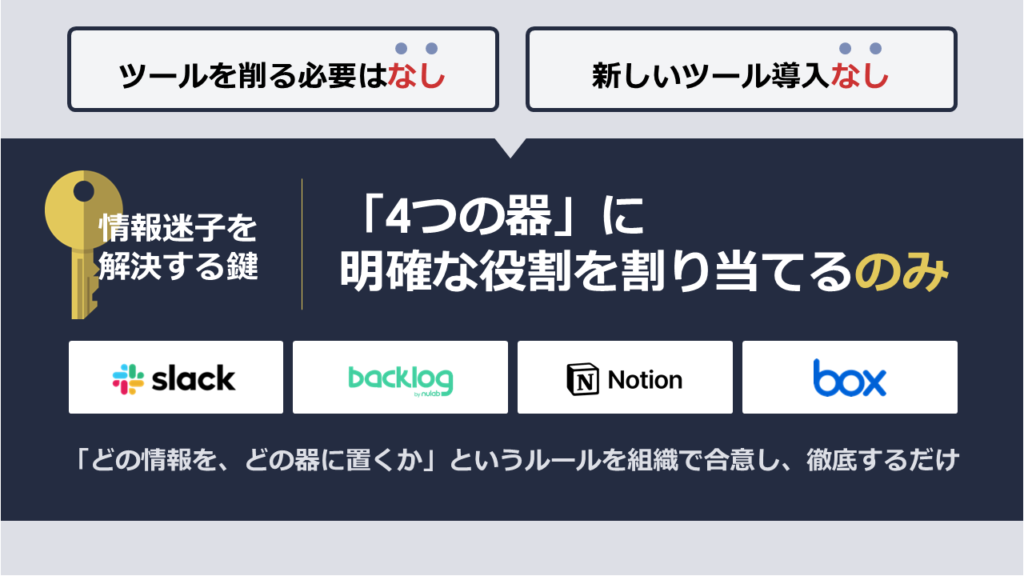 必要なのは、Slack・Backlog・Notion・Boxという4つの器に、明確な役割を割り当てること——ただそれだけです。