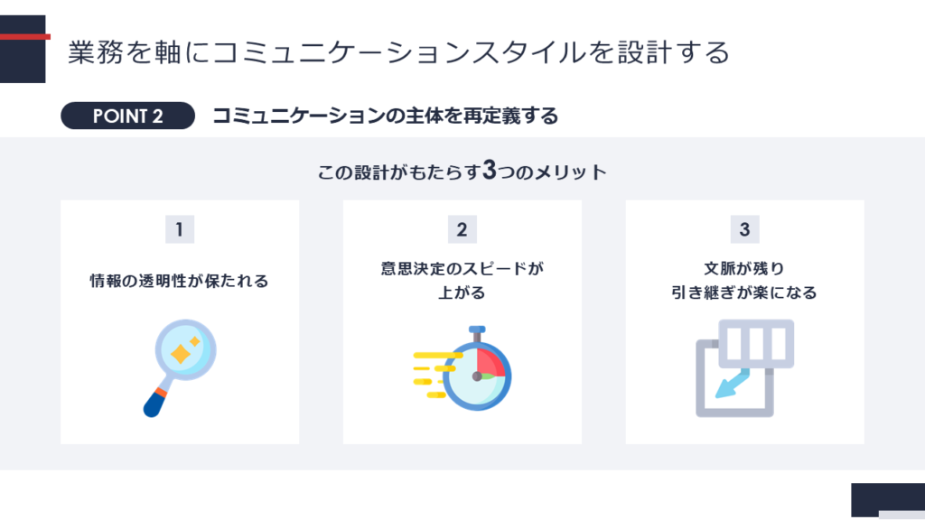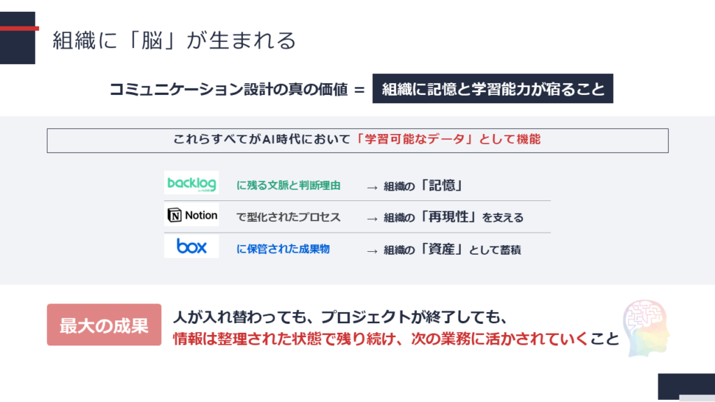 このコミュニケーション設計の真の価値は、組織に記憶と学習能力が宿ることです。