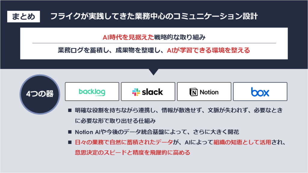 フライクが実践してきた「Backlog中心の業務ログ蓄積」「Notionでの型化」「Boxでの成果物保管」という設計は、まさにAI活用の土台として機能します。
