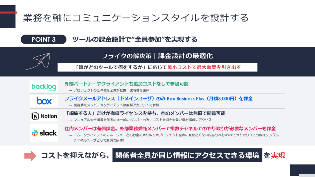 ここからは、フライクが実践する具体的な解決策を公開します。Slack・Backlog・Notion・Boxという4つのツールに明確な役割を与え、業務を中心としたコミュニケーション設計を実現する方法を、実例とともに詳しく解説します。