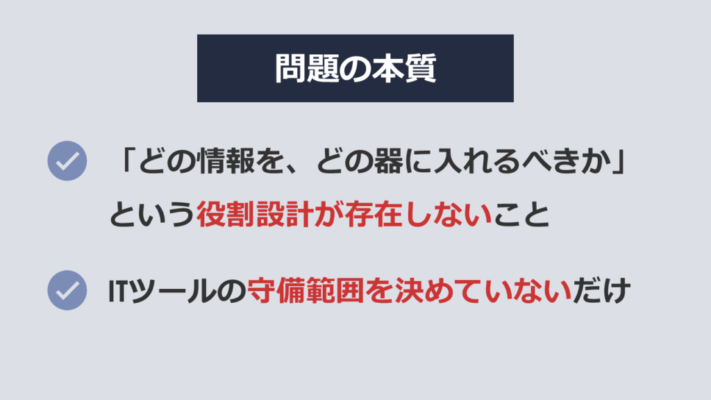 それは「ツールが悪い」のではなく、「どの情報をどこに置くべきか」という設計ができていないからです。