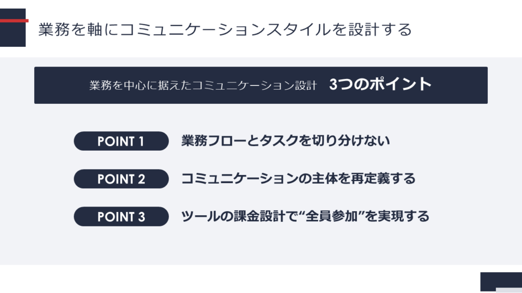 フライクの業務中心のコミュニケーション設計をまとめると、以下の3つの柱で成り立っています。