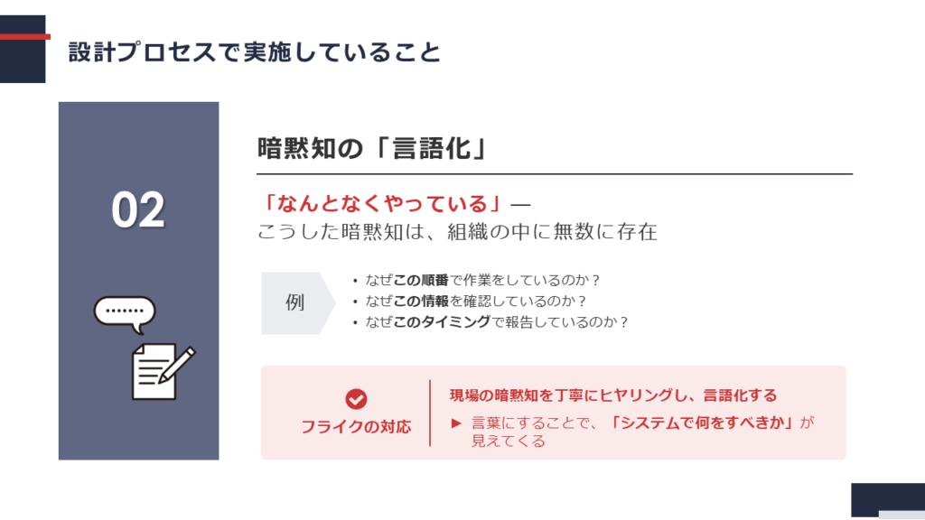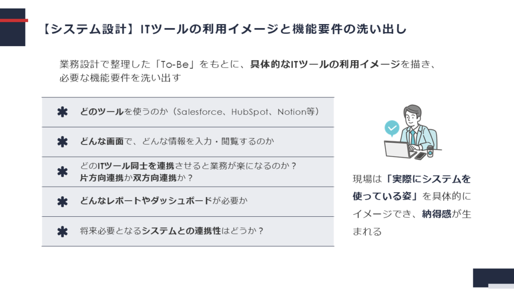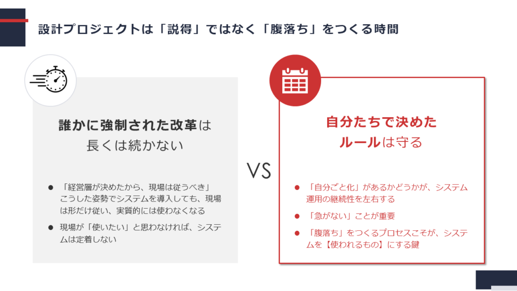 この「腹落ち」をつくるプロセスこそが、システムを”使われるもの”にする鍵なのです。