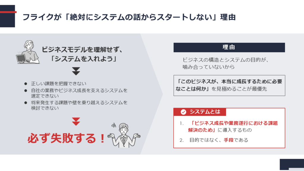 だからこそ、フライクは絶対にシステムの話から始めないのです。