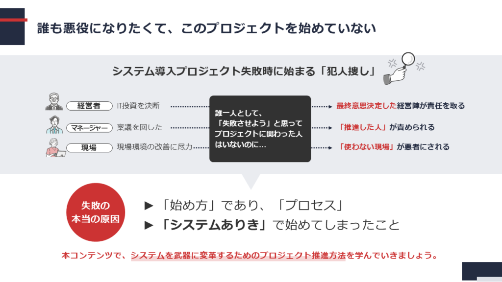 システム導入プロジェクトが失敗したとき、必ず「犯人探し」が始まります。