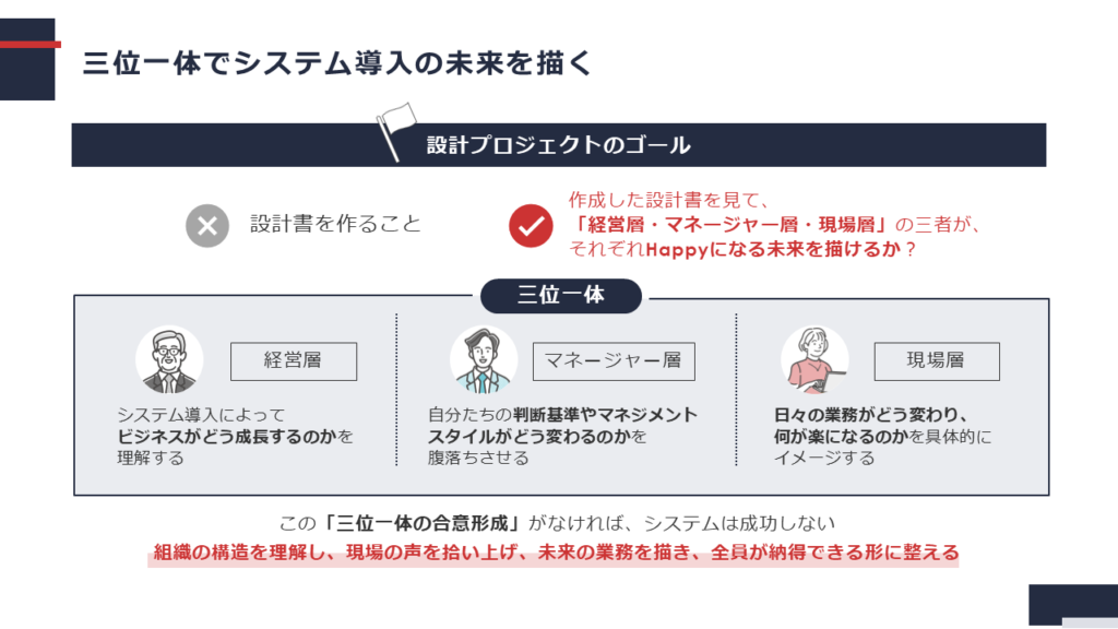 設計プロジェクトに参加することで、マネージャー層は経営層と同じ目線で組織を捉えられるようになります。これは、システム導入後の運用を成功させるだけでなく、マネージャー自身の成長にもつながる重要な変化です。