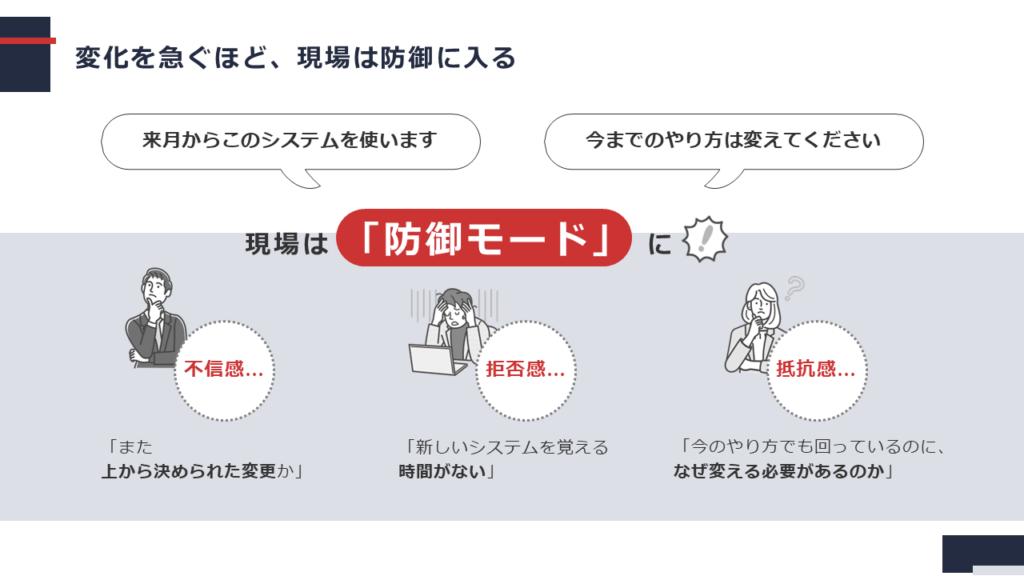 どれだけ説得しても、現場が心から納得していなければ、システムは使われません。