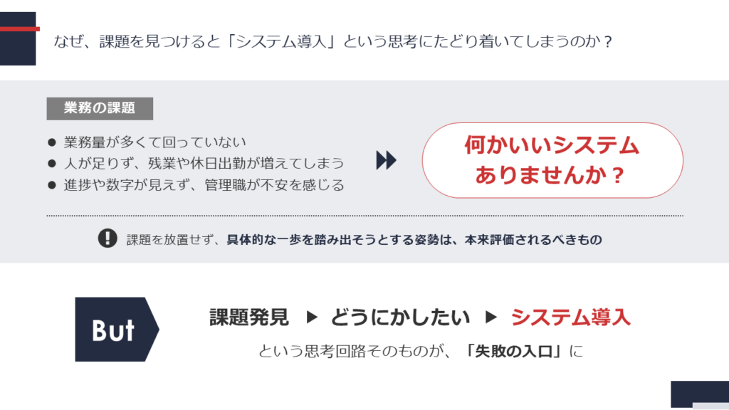 なぜ、課題を見つけると「システム導入」という思考にたどり着いてしまうのか?
