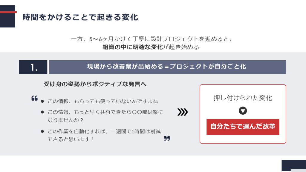 時間をかけることで組織の意識が変わる——これは理想論ではなく、現実的な成功要因です。