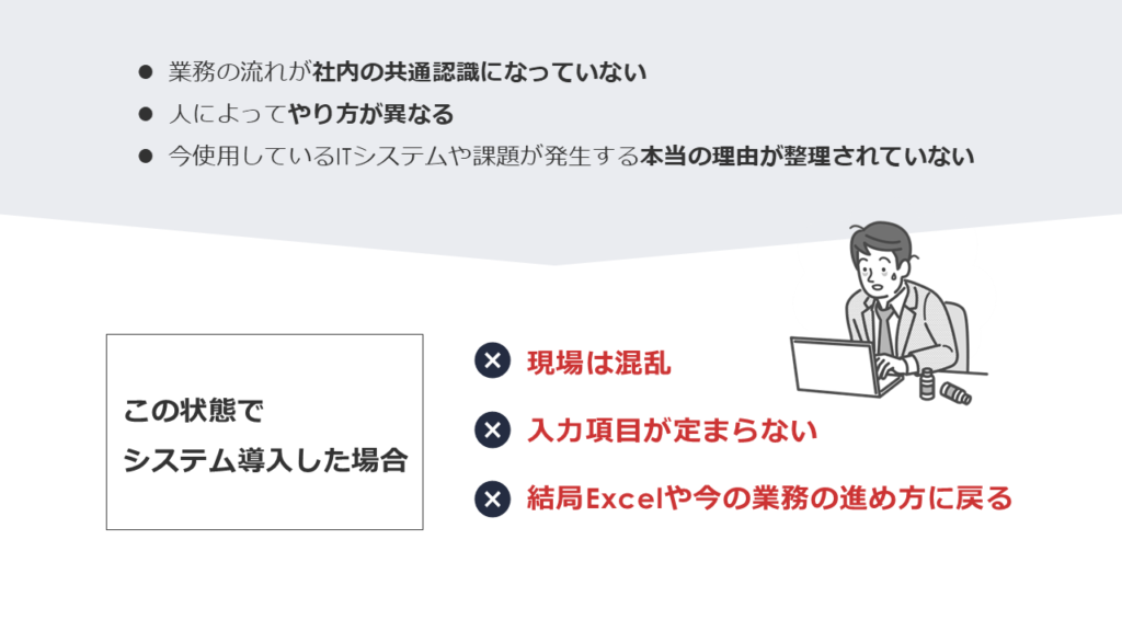 業務の流れが社内の共通認識になっておらず、人それぞれやり方が異なり、今使っているITシステムや課題が発生する本当の理由が整理されていない状態でシステムを入れても、