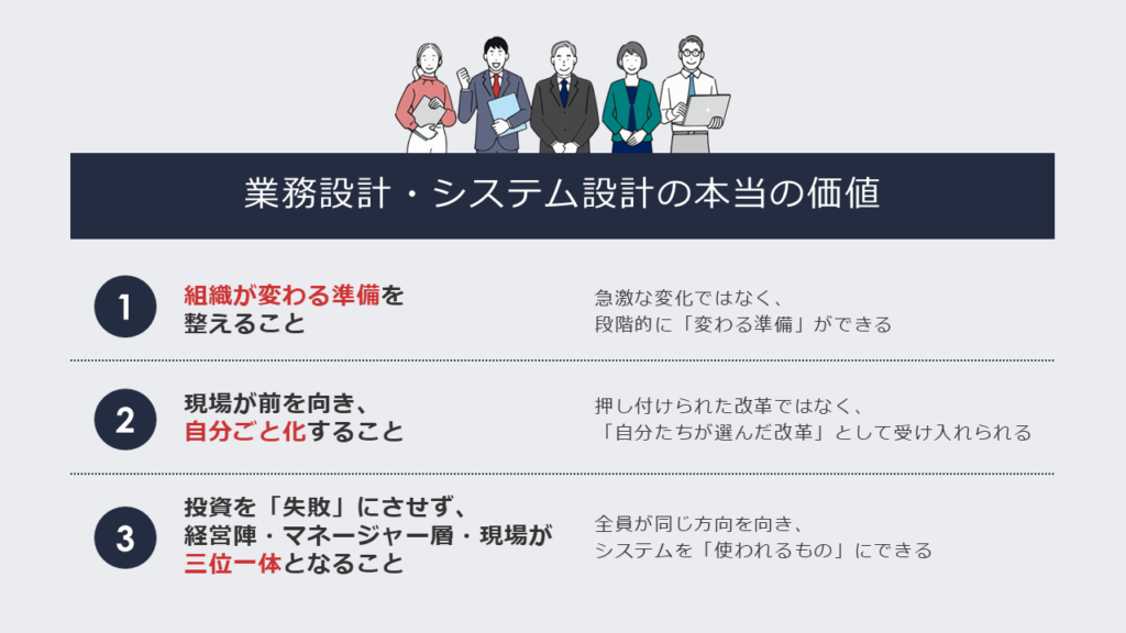 「業務設計プロジェクト」を丁寧に進めることで、次のような価値が生まれます。