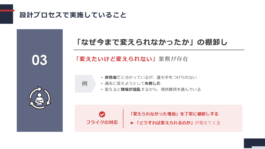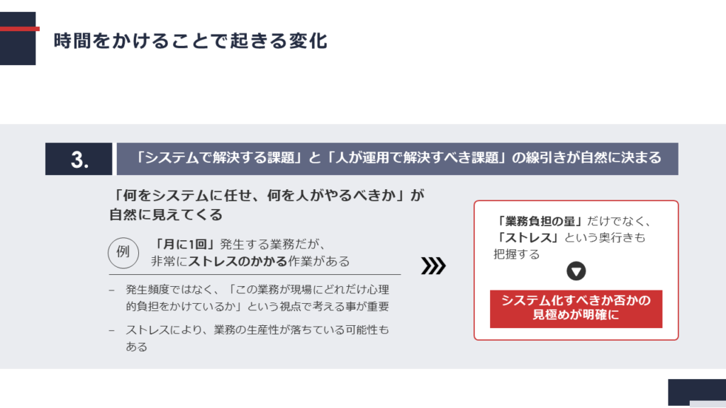 ③ 「システムで解決する課題」と「人が運用で解決すべき課題」の線引きが自然に決まる