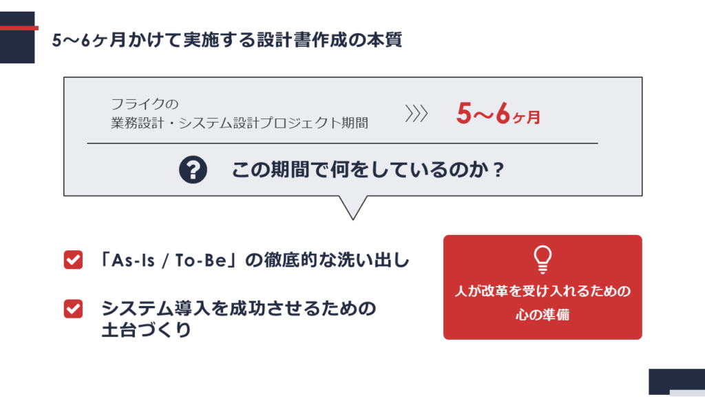 丁寧に設計を進めることで、この線引きが明確になり、システムと人の役割分担がスムーズに決まります。これは、システムを「押し付けられたもの」ではなく、「自分たちが選んだ改革」として受け入れるための重要なプロセスです。