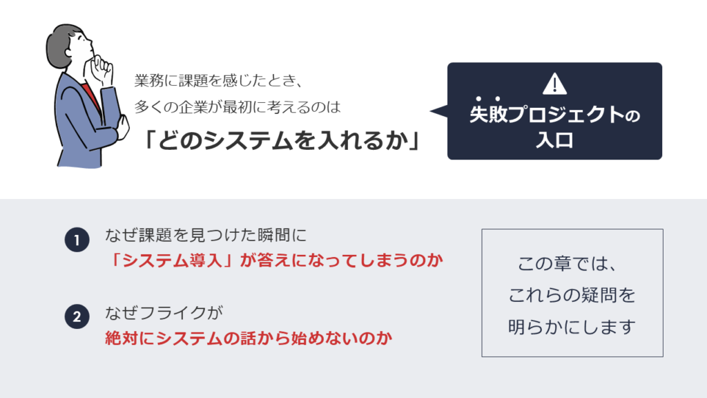 この章では、なぜ課題を見つけた瞬間に「システム導入」が答えになってしまうのか、そしてフライクがなぜ絶対にシステムの話から始めないのかを明らかにします。