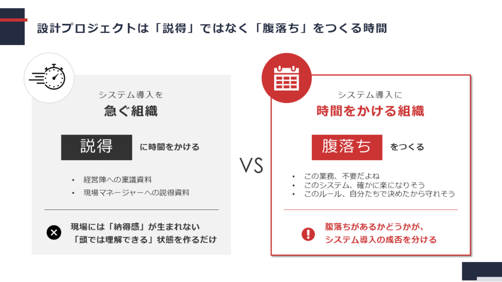 一方、時間をかけて設計プロジェクトを進める組織は、「腹落ち」をつくります。