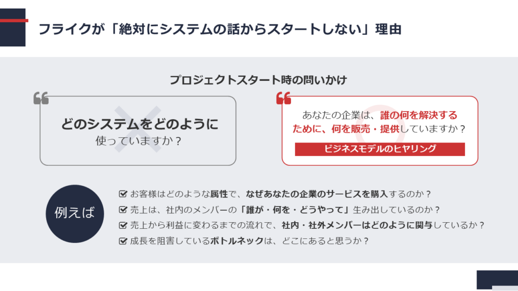フライクがプロジェクトを始めるとき、「どのシステムをどのように使っていますか?」という質問は一切しません。たとえシステム刷新プロジェクトであってもです。