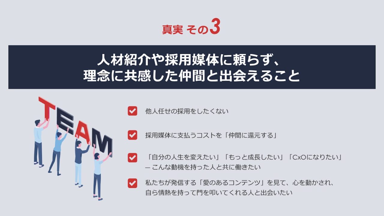 - 人材紹介や採用媒体に頼らず、理念に共感した仲間と出会えること